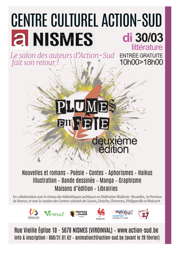 Le dimanche 30 mars, de 10h à 18h, je participerai au Salon « Plumes en fête » dans les locaux d’Action Sud à Nismes.